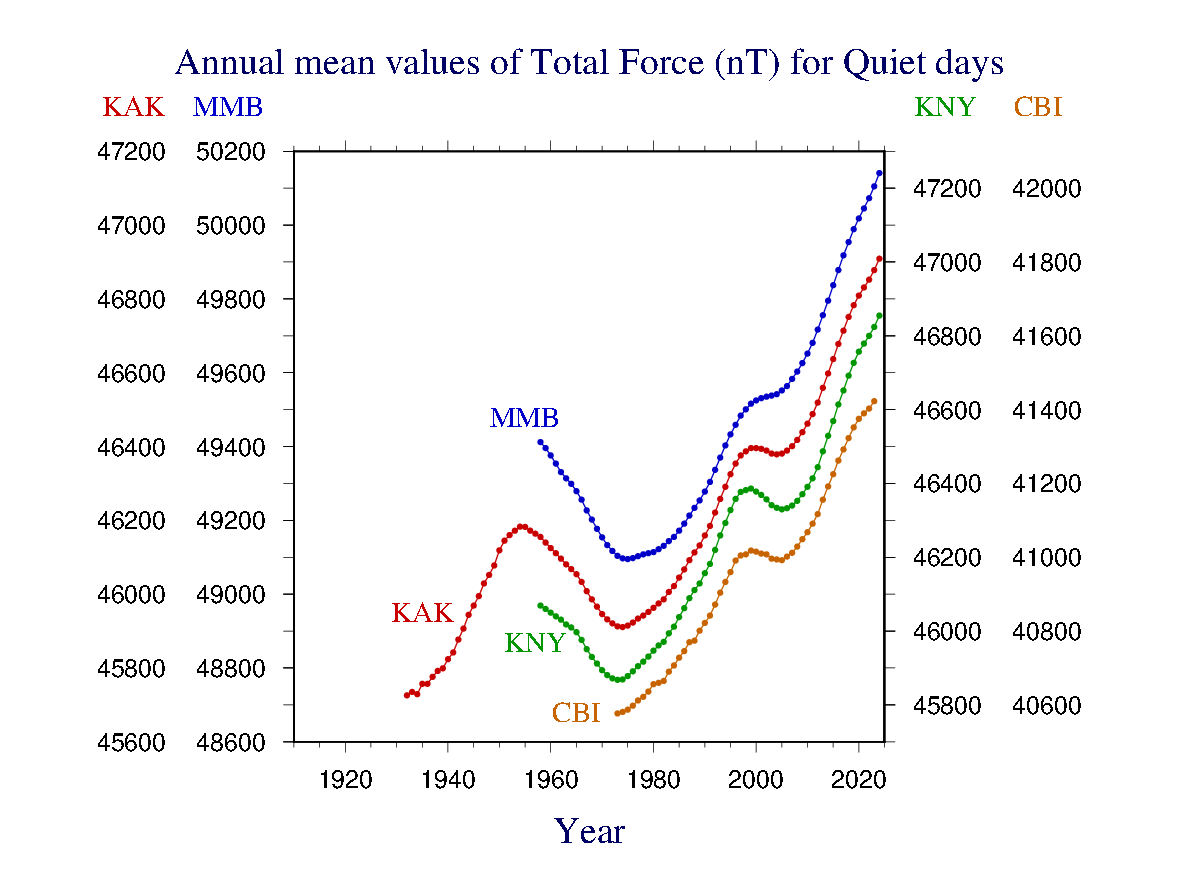 Home > Observation data > Temporal geomagnetic variations > Annual means > Annual mean (Quiet days)