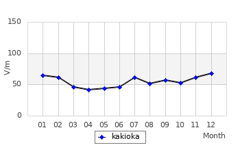 下図は地表付近の大気の電場の長期的な変化を見るため、降水などの局地的に短周期で変化するものの影響を受けていない観測日(静穏日)を選んで1日の平均値を算出し、それを一月毎に平均した値を示したものです。