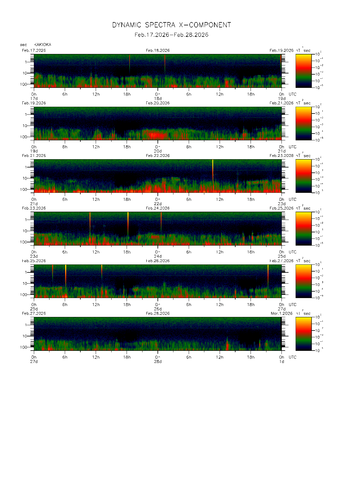 柿岡で観測された地磁気0.1秒値のダイナミック・スペクトル (2026年02月 1〜28日)