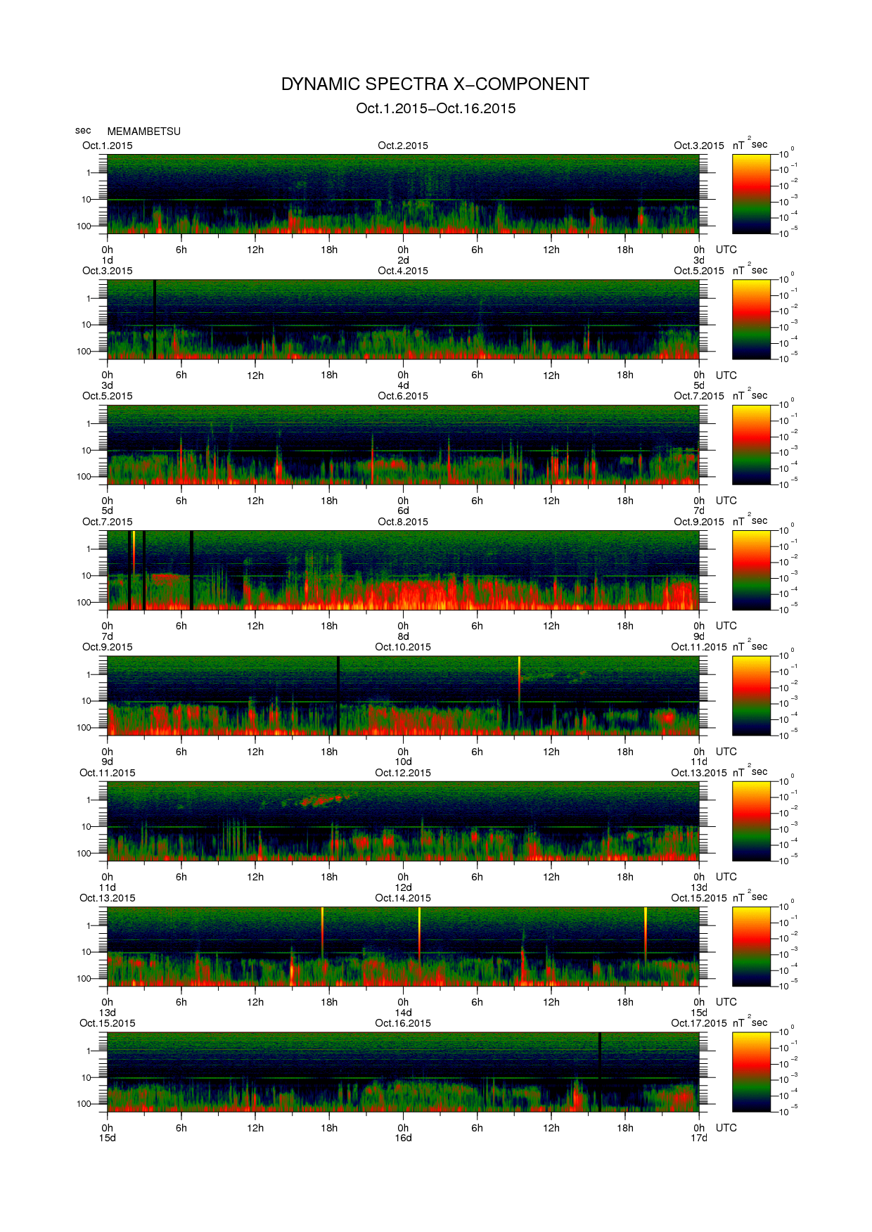 Dynamic spectrum of 0.1-second values of the geomagnetic field observed at Memambetsu (01 - 31 Oct. 2015)
