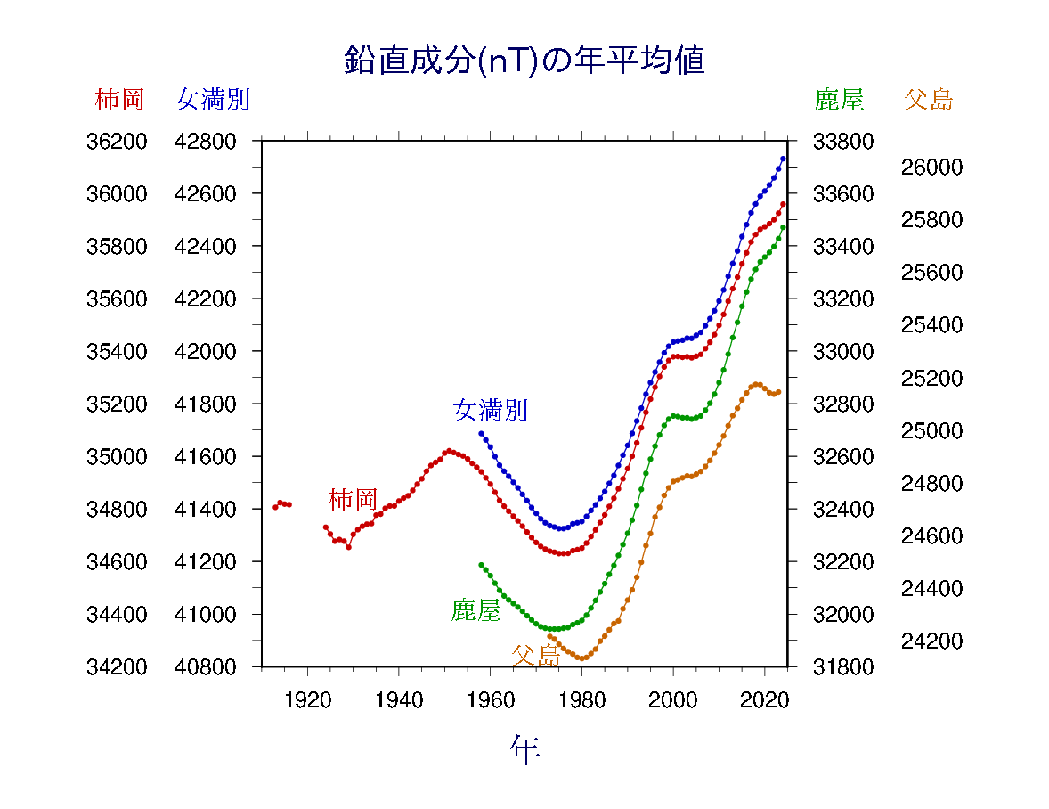 図は柿岡・女満別・鹿屋・父島の観測開始からのデータを示します。