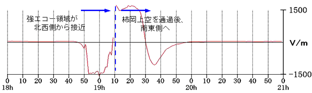 2006年度に大気電場の急変が観測された事例は、計57事例あった。各事例日の-10℃の気温高度エコー強度を比較すると、1事例を除き、雷電の有無に関わらず柿岡から半径30km以内に20dBz以上の反射強度を持つエコー領域が存在することが分った。-10℃の気温高度の強エコー領域では対流雲中で雹(ひょう)や霰(あられ)が作られ、この雹や霰の摩擦による電荷分離が大気電場の急変の原因と考えられる。(図2)