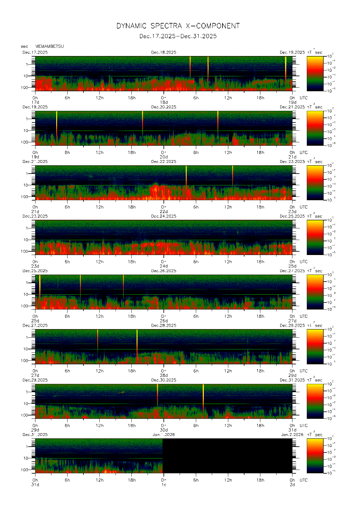女満別で観測された地磁気0.1秒値のダイナミック・スペクトル (2025年12月 1〜31日)
